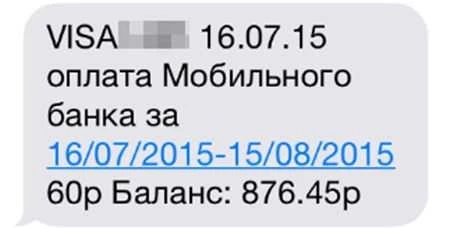 Оплата мобильного банка проводится по авансовой схеме. Это означает, что абонентская плата списывается в начале месяца и требует наличия на карте свободных средств. Если средств не хватает, действие услуги автоматически приостанавливается. Оплата sms-сообщений проводится по стандартным тарифам оператора сотовой связи. Sms будут приходить даже в том случае, если вдруг на вашем номере окажется минусовой баланс.
