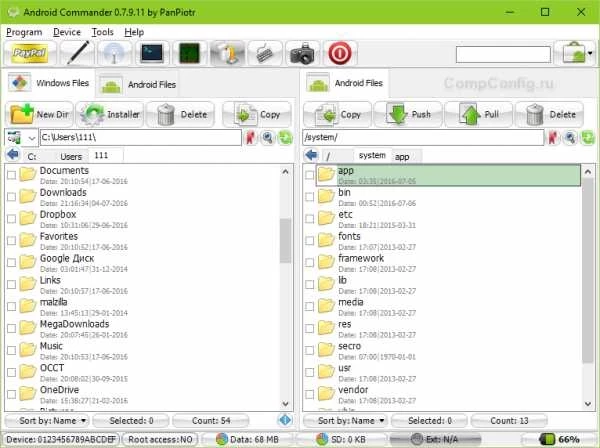 Далее подключите гаджет к ПК как USB-накопитель и запустите с правами администратора Android Commander. В нем, в отличие от проводника Windows, отображаются защищенные системные файлы и каталоги ОС Андроид — так же, как, например, в Root Explorer — диспетчере файлов для root-пользователей.