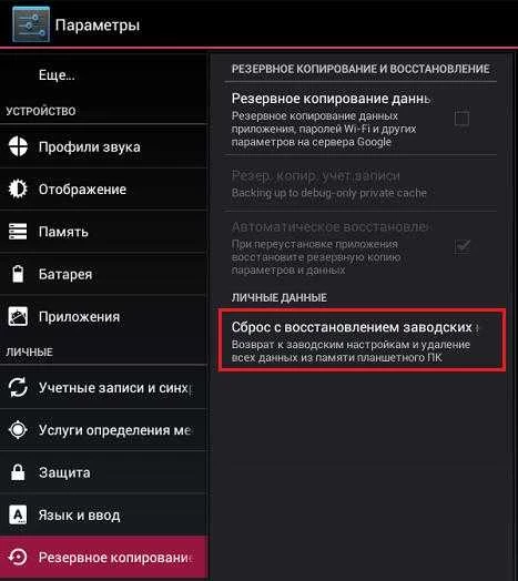 Зайдите в приложение «Параметры», откройте раздел «Личные» — «Резервное копирование» и выберите «Сброс с восстановлением заводских настроек».